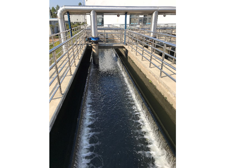 反硝化深床濾池池體,采用狹長(zhǎng)廊道使進(jìn)水均勻;濾磚結(jié)構(gòu)使濾池反沖洗效果良好;反硝化過(guò)程中產(chǎn)生的氮?dú)鈺?huì)使過(guò)濾產(chǎn)生氣阻,通過(guò)驅(qū)逐氮?dú)猓_保濾池運(yùn)行效果。